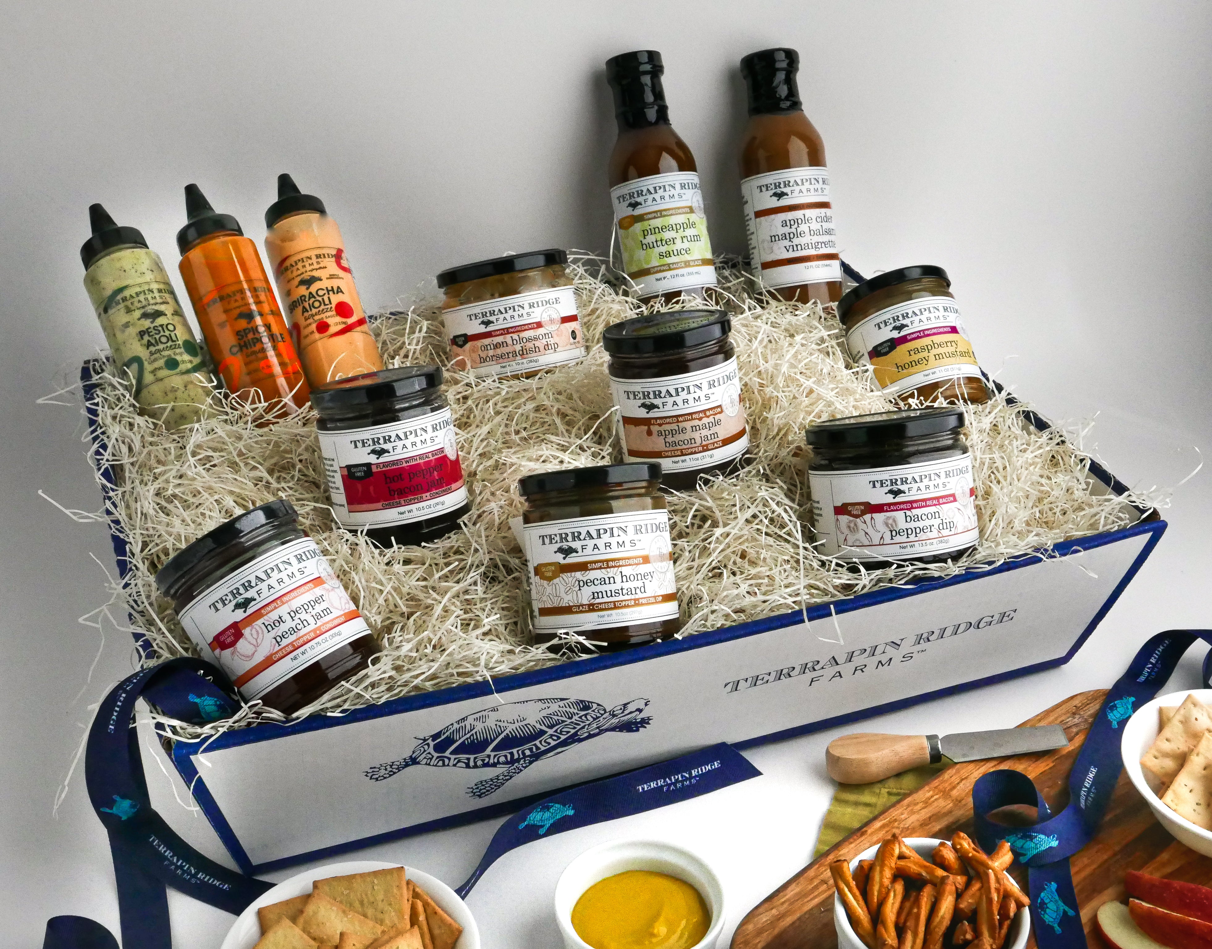 The Favorite Flavors gift basket is a delightful collection of 12 of our team’s favorite Terrapin Ridge Farms products. Indulge in the bold and zesty notes of Sriracha Aioli and Spicy Chipotle Garnishing Squeeze or enhance your dishes with the unique flavors of Pesto Aioli and Onion Blossom Horseradish Dip. Savor the sweet and savory combinations of Hot Pepper Bacon Jam, Apple Maple Bacon Jam, and the Raspberry Honey Mustard. With exciting additions like Hot Pepper Peach Jam, Pecan Honey Mustard, and Pineapple Butter Rum Sauce, this basket also includes the refreshing Apple Cider Maple Balsamic Vinaigrette and Bacon Pepper Dip. Send with confidence to all your favorite Foodies.